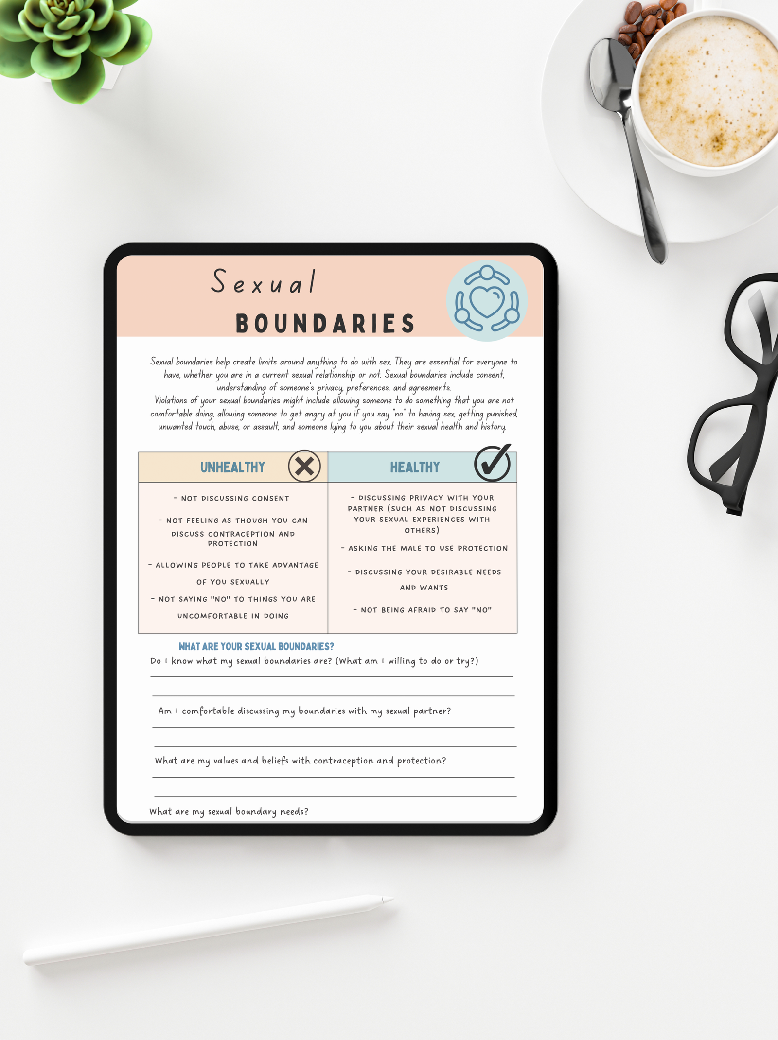 - Choose a section (e.g., boundaries or red flags) and complete the prompts together or solo.